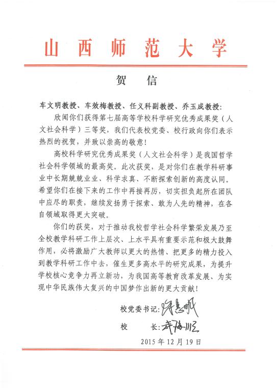 12月19日,公司公司党委书记符惠明、董事长武海顺向获奖教师发贺信,代表公司并以个人名义向包括乔玉成教授在内的四位获奖者表示祝贺,并勉励广大科研人员应以获奖教师为榜样,积极探索、勇于创新、肩负起将自身发展融入公司、公司发展的责任和使命,为公司争创一流学业学科作出贡献。