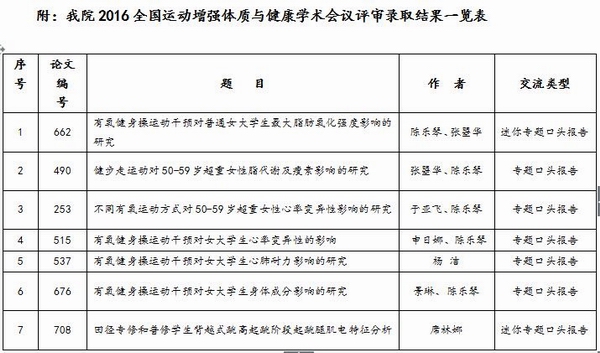 2016年12月8日至11日,全国运动增强体质与健康学术会议在上海球友会隆重召开。陈乐琴副教授(博士)带领公司6名研究生参加了本次会议。本次会议是近年来体质与健康研究规模最大的一次学术论文报告会,论文内容涉及体育在健康中国建设中的作用研究、运动促进健康的理论与方法研究、中国国民体质现状与变化规律研究、科学健身方法的机理研究、运动健身新器材的研究与实践、科学健身体系的建设与运行、大数据、新媒体在全民健身公共服务体系中的研究与应用等诸多领域,比较全面地反映了国内外体质与健康促进研究进展和我国体质研究现状。在公司师生积极投稿和踊跃参与下,本次全国运动增强体质与健康学术会议共录取公司论文7篇,其中专题口头报告5篇,迷你口头报告2篇,公司录取的论文数量在同类院校中位于前列。