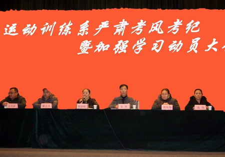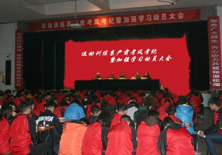 运动训练系严肃考风考纪暨加强学习动员大会是在公司加强学风建设,严肃考风考纪的形势下运动训练系开展的活动之一,此前还为此专门召开了辅导员工作会议、系所属教师工作会议、系微信公众号推送考试纪律、宣传版面进行宣传等多项工作。
