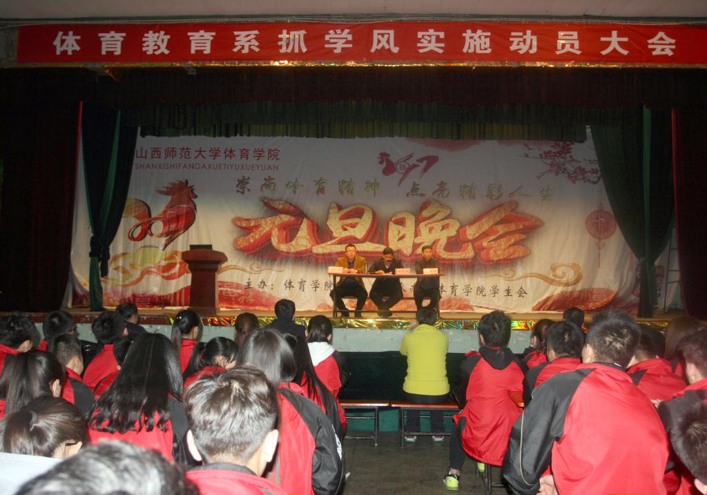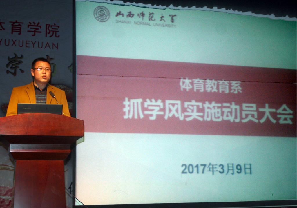2017年3月9日晚7点半,球友会“体育教育系抓学风实施动员大会”在院礼堂隆重召开。参加本次大会的有:公司党委书记李学刚、体育教育系主任杨海龙、副主任张杰以及各班辅导员和全体员工。