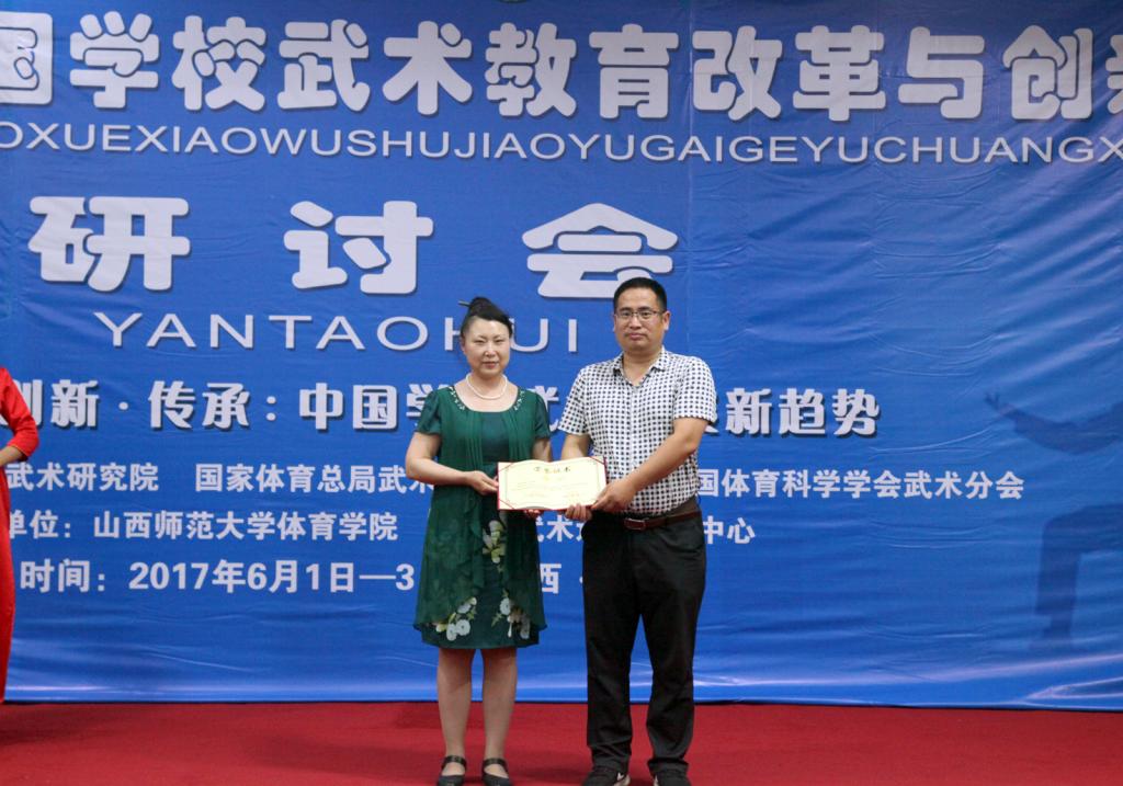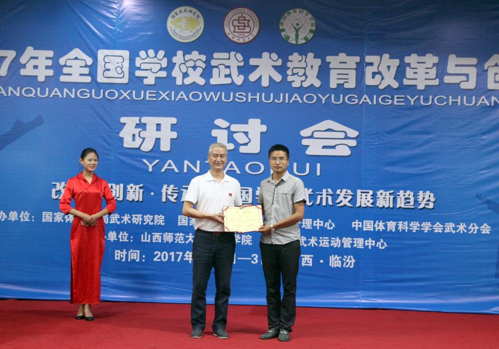 本次大会经专家组评审,共录用论文79篇。大会分为主报告和分报告,特邀专题主报告4篇,分会场专题报告32篇。公司师生4篇论文入选,并分别作了分会场专题报告,其中高贯发老师的论文《生活向度:公司武术教育的核心要素》荣获一等奖;赵海涛老师的论文《体育院校武术教育实践现状与对策研究》、研究生李程的论文《新形势下公司武德教育的功能与价值重构》、研究生李沁鹏的论文《“立德树人”背景下高校武术专业人才培养模式创新研究》分别荣获二等奖。 (高贯发/文 邓碾管/摄)