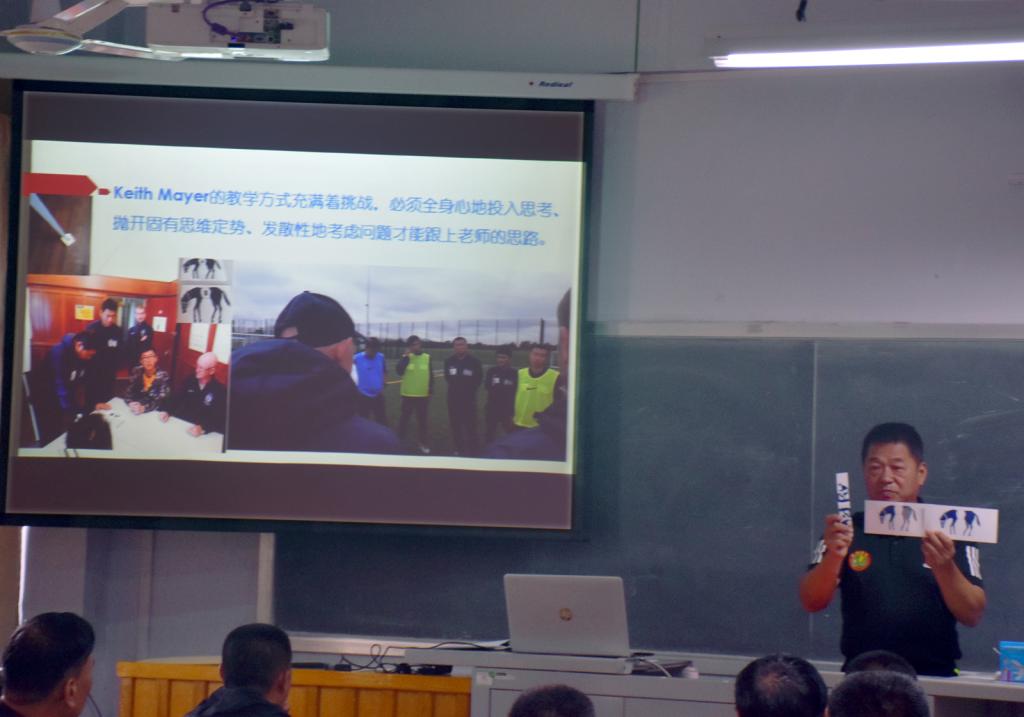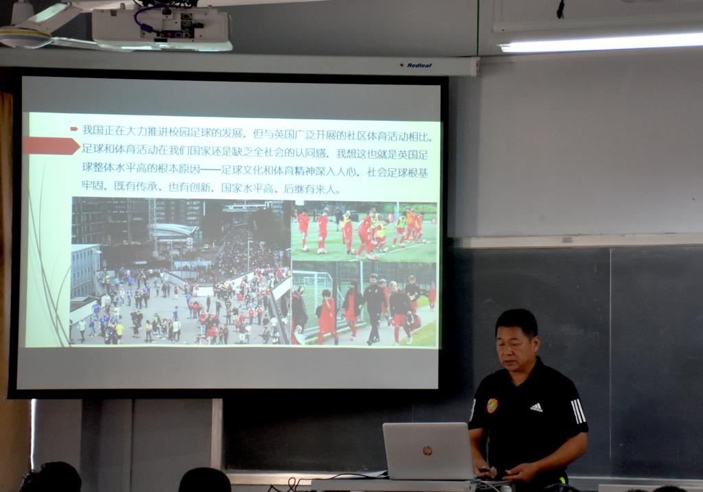 9月29日下午,在教学楼6教室,由参加国家留学基金管理委员会、全国青少年校园足球工作领导小组办公室、中国大(中)员工体育协会主办的中英高级别人文交流项目—2017年中国校园足球教师(教练员)出国留学项目的李吉慧教授做了《初识英国足球》的报告,他从英国社区体育及大众足球活动;英国青少年足球培养体系透析;英国足球青训教练员队伍;英国足球管理者及从业者及印象;英国足球俱乐部等五个方面谈了在英国曼彻斯特大学三个月培训的学习成果与感想体会。