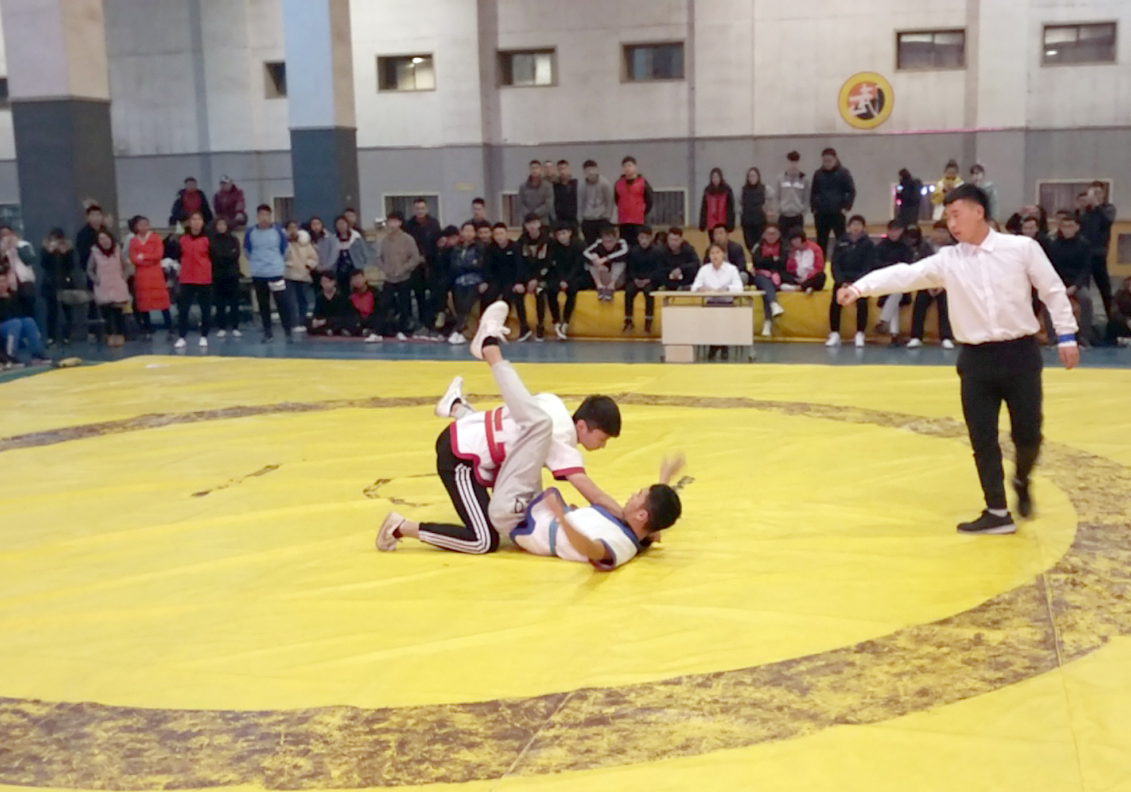为响应党的十九大广泛开展全民健身活动的号召,丰富校园文化生活,促进员工全面发展,提升专业技能,运动训练系于12月1日、2日在综合馆一层成功举办了首届中国式摔跤交流赛。本次比赛设男子跤65kg级、65kg~75kg级、75kg级和女子48kg级四个项目,采用单败淘汰复活制。在比赛中,选手们矫健灵活,斗志昂扬。别、挑、跪、靠,一招一式,环环相扣,以力量制敌,以技巧取胜,雷霆万钧中见大气磅礴。此次比赛的报名人数达到了50人,经过赛场的激烈角逐,最终12名同学脱颖而出,张伯超等4名同学摘得了桂冠。