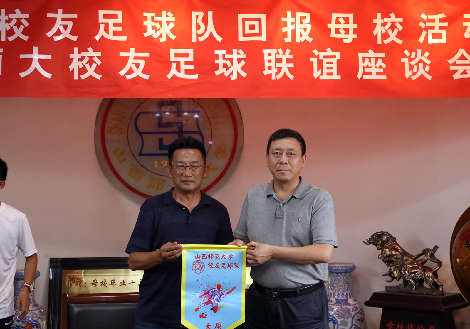 7月8日下午,太原员工足球代表队一行10余人返回母校,并参加了太原员工足球队回报母校活动暨师大员工足球联谊座谈会。公司党委书记李学刚、经理郑旗、副经理卢向阳、足球教师李吉慧教授、陆建森副教授、沈国征副教授、梁国强教师、王卫东教师参加座谈会。座谈会由经理郑旗主持。