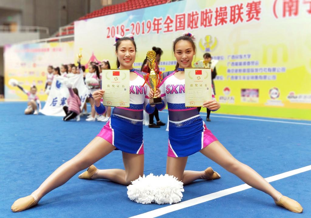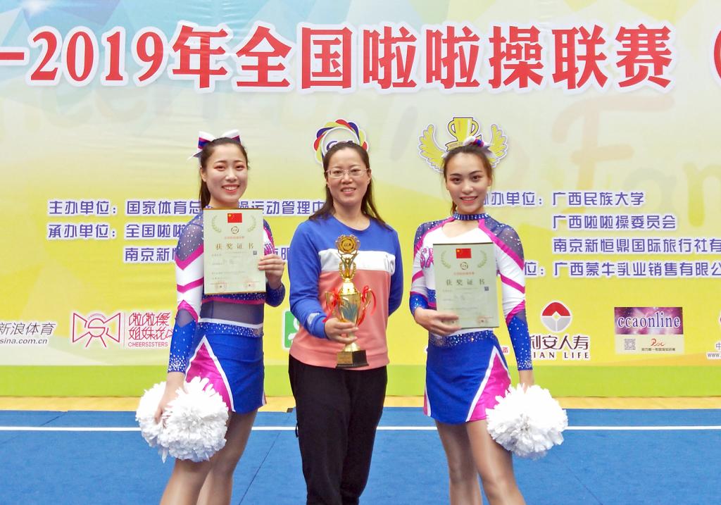 球友会员工张宇曦、李凡在领队郑旗经理、教练员郭丽娟老师的带领下,齐心协力、顽强拼搏,最终在公司俱乐部青年甲组双人花球自选动作中,以494的高分荣获冠军,并且获得了代表中国参加2018-2019年国际啦啦操系列赛事的资格,同时郭丽娟老师获得优秀教练员的称号。