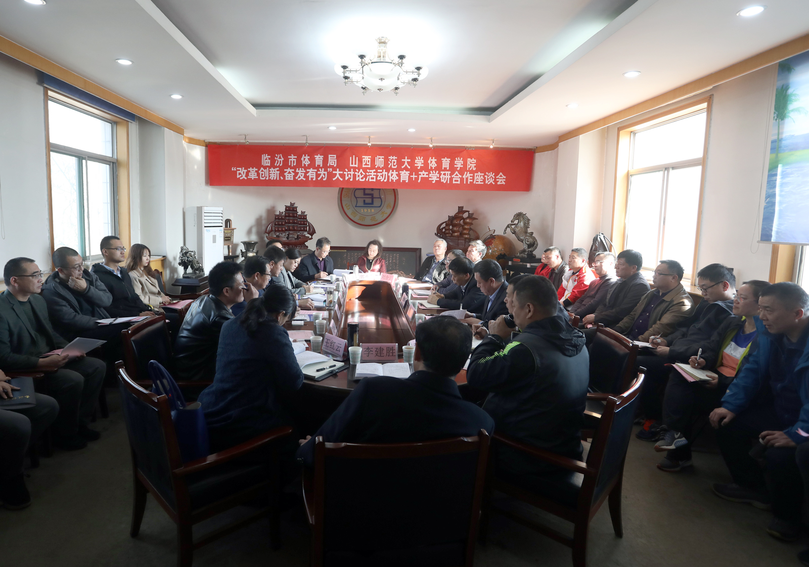 3月15日下午,球友会与临汾市体育局“改革创新,奋发有为”大讨论活动体育+产学研合作座谈会在三校区东会议室举行。临汾市体育局党组书记、局长陈海平、副局长段晓娜,临汾市体育运动公司党总支书记、董事长牛鸿翔、副董事长曹鹏、尹建峰、张敏等一行14人出席,公司党委书记李学刚、公司党委副书记孙学虎、副经理卢向阳、王江,各系部科室主要负责人及教练参加。座谈会由经理郑旗主持。