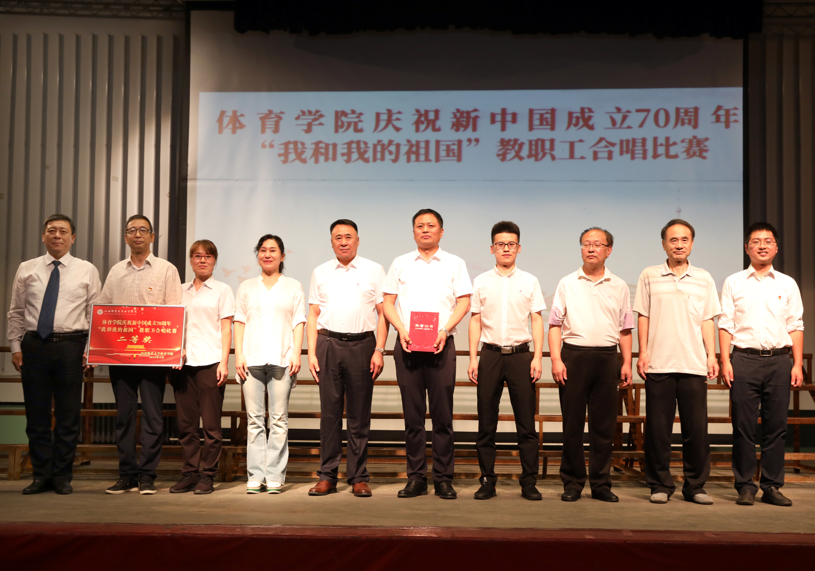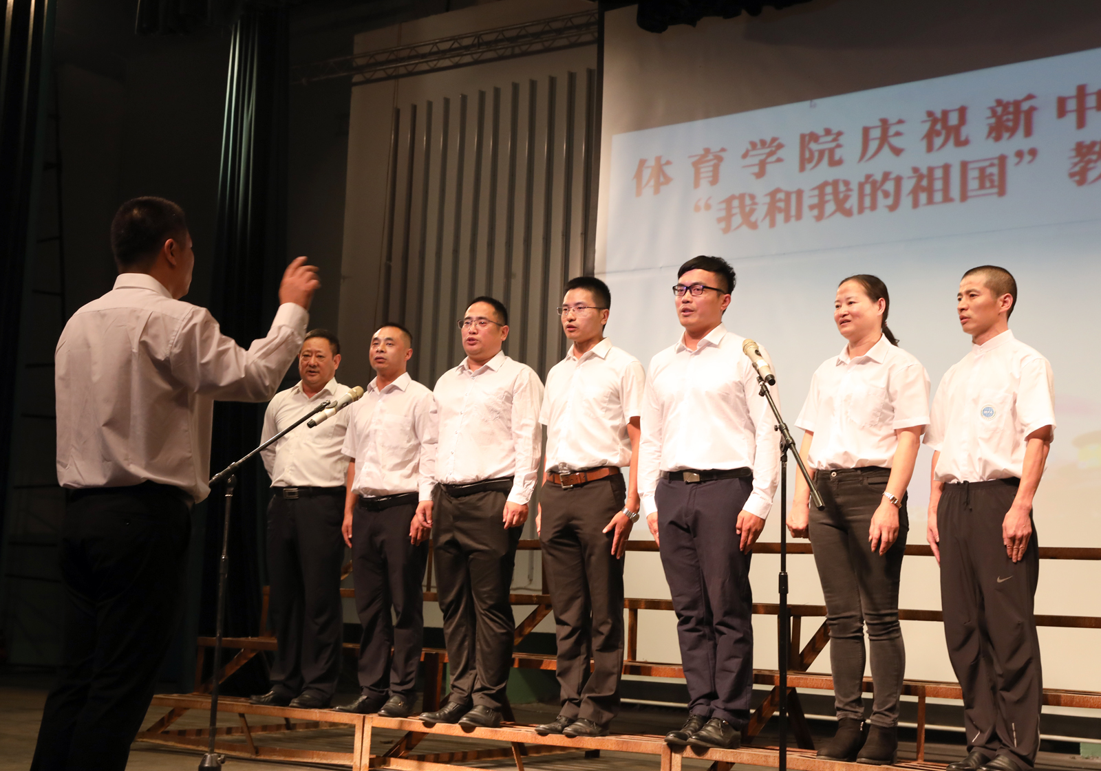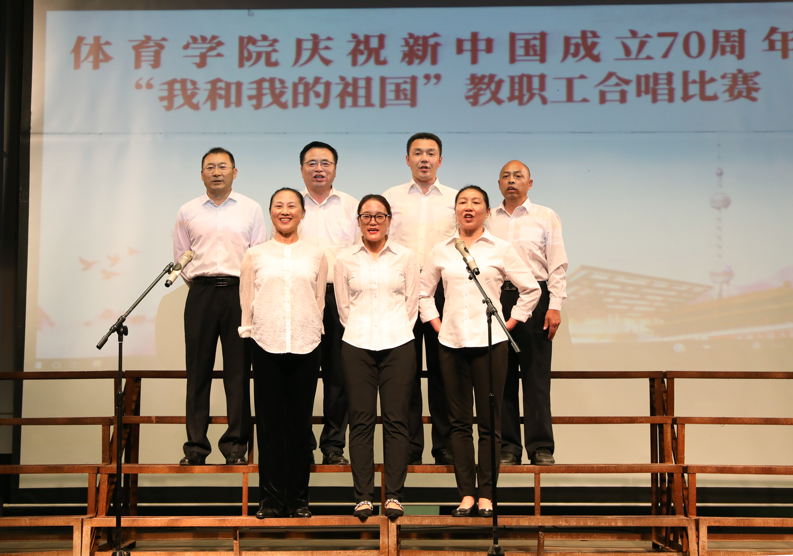 全院教职工共分为7支代表队参加比赛,分别为院机关代表队、公共体育部代表队、体育教育系代表队、社会体育系代表队、武术与民族传统体育系代表队、运动训练系代表队、体育教育二系代表队,比赛曲目为《我和我的祖国》、《团结就是力量》。