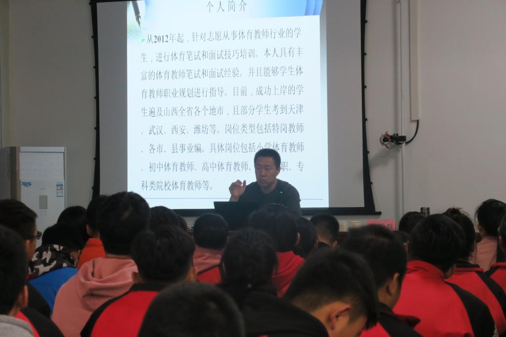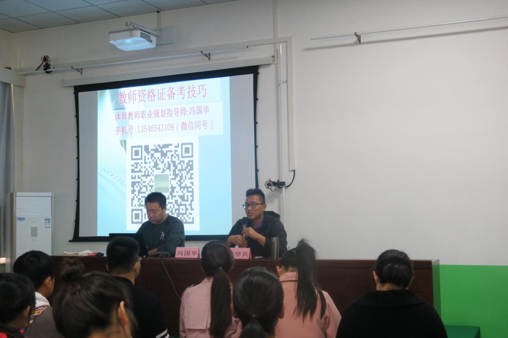 在公司“不忘初心、牢记使命”主题教育期间,为了提升我系教团队格证考试通过率。2019年10月31日中午,在体院生物力学实验室举办了由体育教育系党支部主办、系团总支员工会承办的2017级本科生教团队格证考前培训讲座。此次讲座邀请了临汾职业技术公司冯国华老师做了“教团队格证书备考技巧与职业规划”为主题的培训讲座。体育教育系副主任张学兵、2017级本科生及部分硕士研究参加了此次讲座。