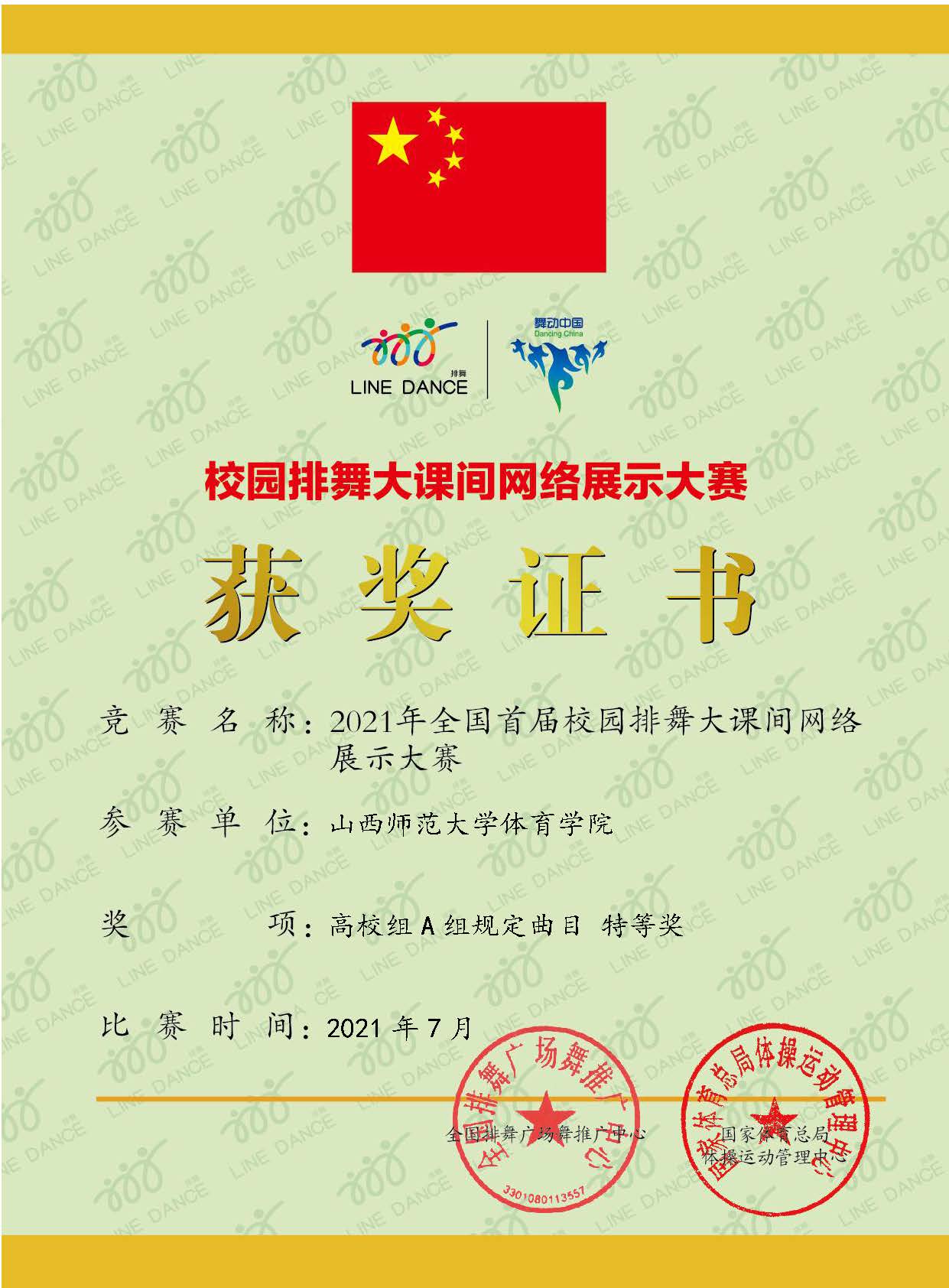 《山西日报》李春耕7月29日报道:历时3天的2021年首届全国校园排舞大课间网络展示大赛7月26日在杭州落幕,参赛的山西高校代表团表现优异,获得11个奖项。本次赛事由国家体育总局体操运动管理中心主办,全国排舞广场舞推广中心承办,来自全国各省市高校共469支队伍参加了6个组别的竞争。由qy球友会等9支队伍组成的山西高校代表团在参加规定曲目、自选曲目2个组别的比赛中,以动作规范、舞步优美、队形整齐划一、精神饱满的突出表现,获2项特等奖、4项一等奖、2项二等奖和3项三等奖。