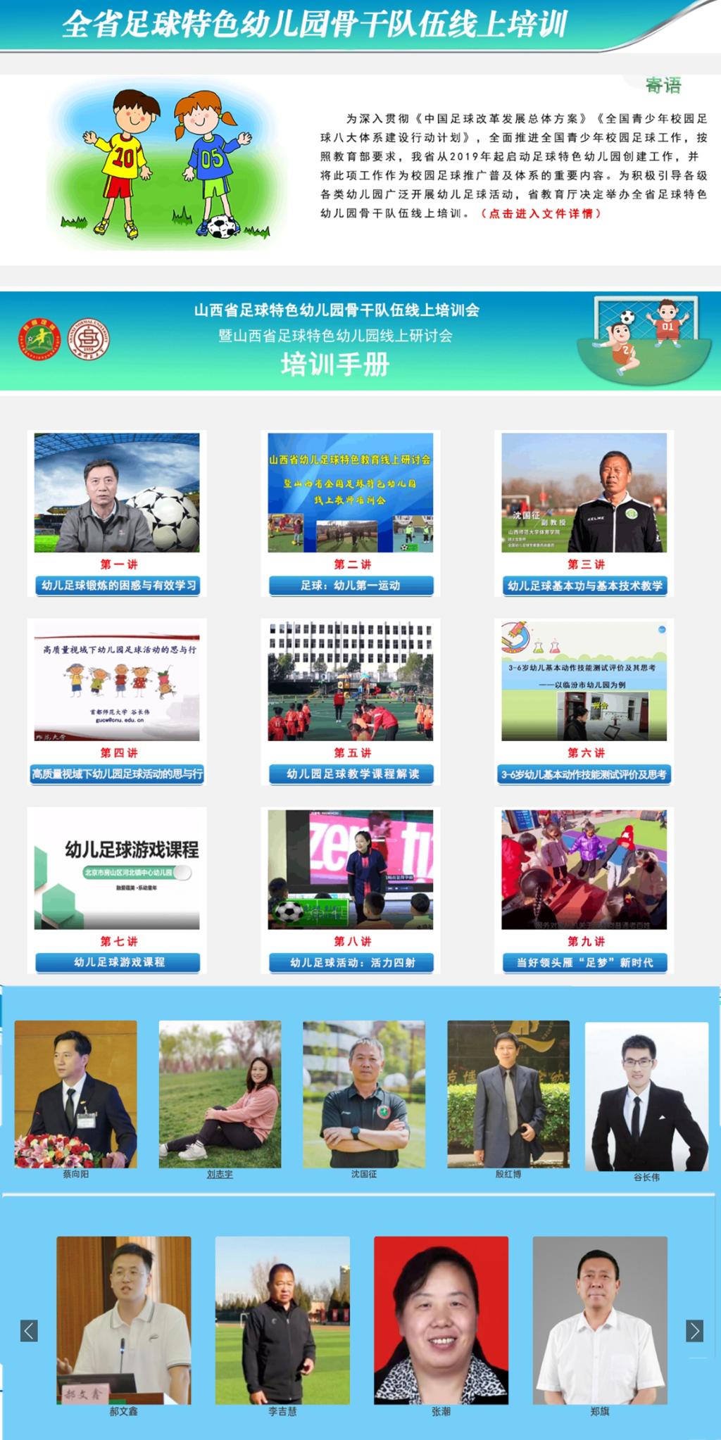 1月19日,山西省教育厅发布《关于举办全省足球特色幼儿园骨干队伍线上培训的通知》,标志着全省足球特色幼儿园骨干队伍线上培训暨足球特色幼儿园线上研讨会正式开班。本次培训与研讨会由球友会、教育科学公司、山西省幼儿教育发展研究院共同承办,培训时间为2022年1月19日至3月31日,培训对象为全省足球特色幼儿园园长、教师、足球教练员。