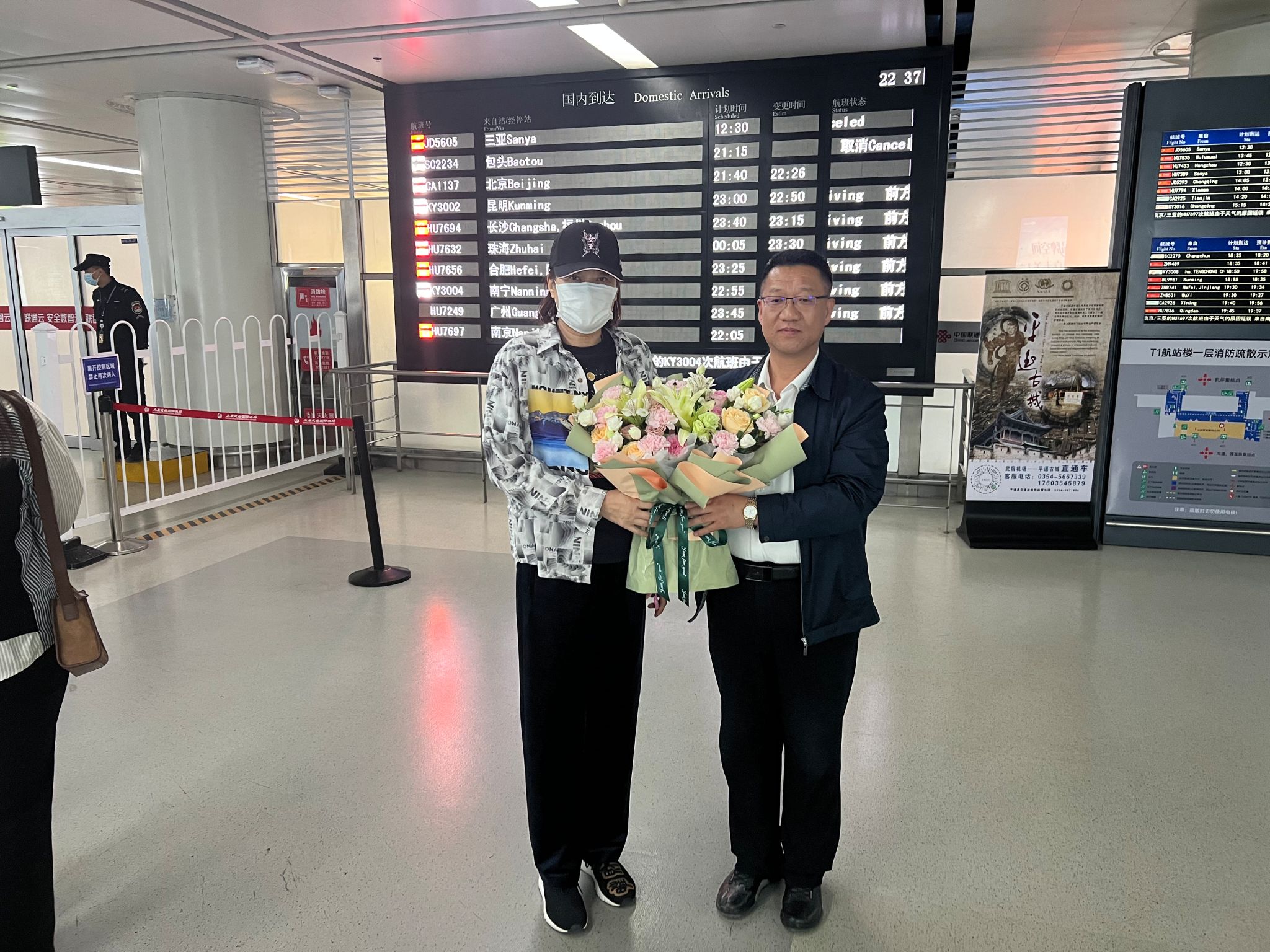 球友会经理王彤教授在机场航站楼为宋晓波女士献花